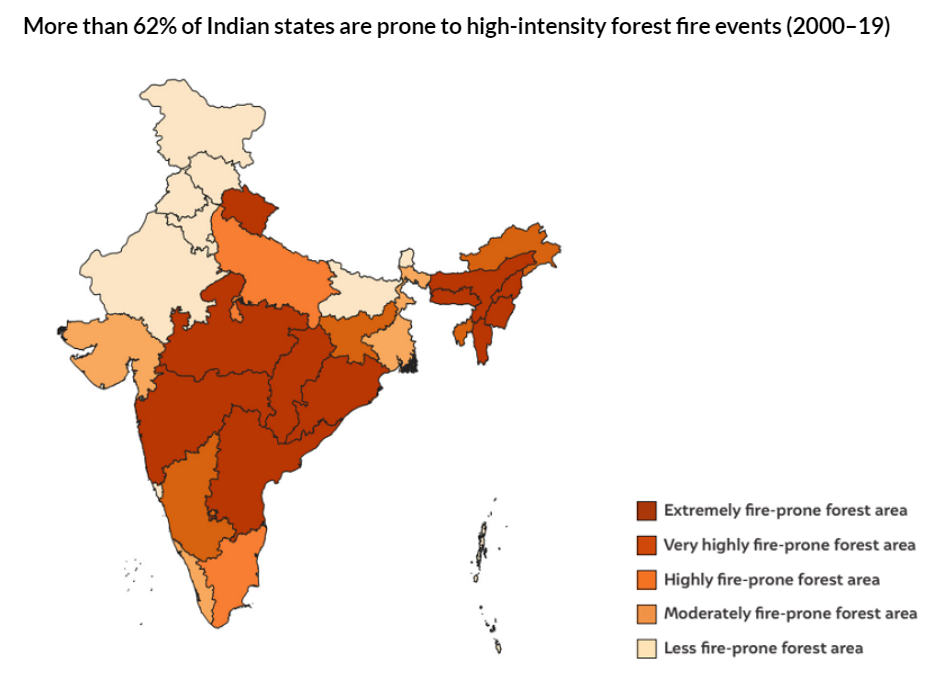 Forest fire situation in 2024: During March 2024, the highest number of fires were reported from Mizoram (3,738), Manipur (1,702), Himachal Pradesh (1,684), Assam (1,652), Meghalaya (1,252), and Maharashtra (1,215) as per FSI data. More than 62% of Indian states are prone to high-intensity forest fire events (2000-19).